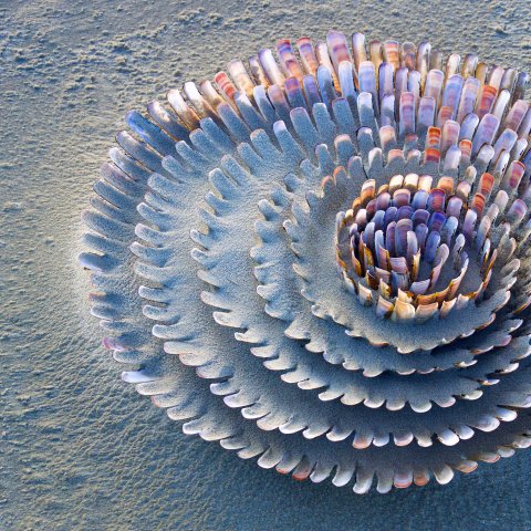 Het ontstaan van de krachtwielen, is altijd anders, worden ter plekke gemaakt en Rob weet nooit van tevoren hoe het zal gaan.: ‘Eerst laat ik mezelf versmelten met een plek. Op een gegeven moment is er hét moment om te beginnen. Ook dat is telkens, ook voor mijzelf, verrassend. Ik weet nooit waaraan en hoe ik zal beginnen. Nadat de eerste schelpen gelegd zijn ontstaat een soort organisch ritme en is het creëren een spel tussen geest en natuur. Tijd verdwijnt en hij beseft dat er geen tijd is'.